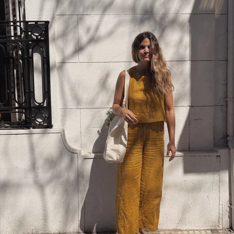 Classic straight-leg, high-waisted trousers with back and side pockets. Lightweight and comfortable for any occasion. The lightweight linen fabric makes them incredibly cool and breathable, and what I love most about these trousers is the vibrant mustard color, which always goes with everything!