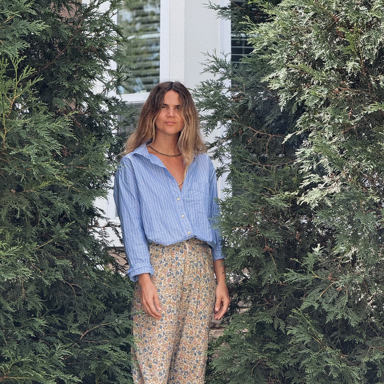 A classic striped shirt that goes with everything, reminding us of our parents in the summer at sunset, after the beach. Or of Mom wearing an oversized shirt with jeans or patterned pants! Love it, love it!